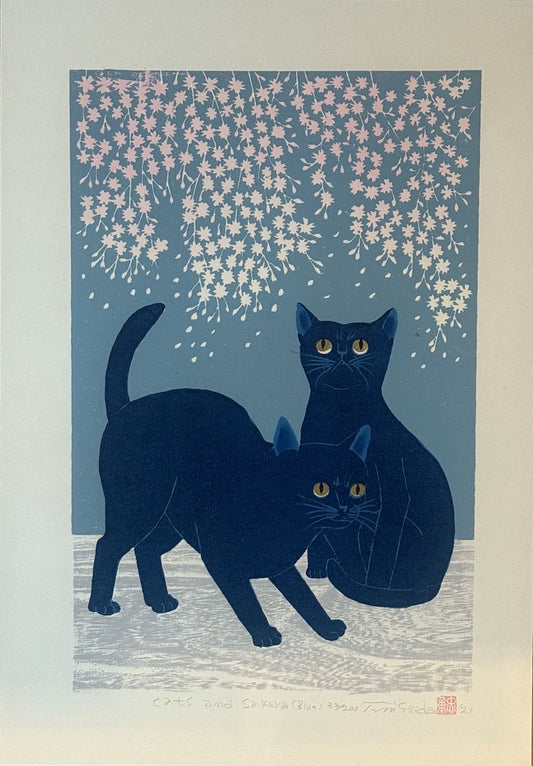Tadashige Nishida : Chats et sakura (bleu) - Estampe japonaise contemporaine