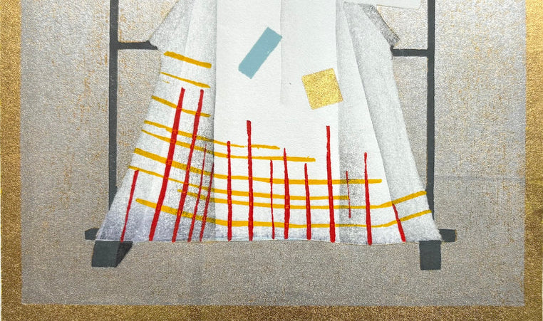 Kunio Kaneko démontre son habileté à marier la tradition japonaise et une esthétique contemporaine. Le gaufrage subtil donne une texture délicate au kimono, tandis que les couleurs minimalistes sont savamment équilibrées pour attirer l'œil sans jamais surcharger la composition. Le fond doré ajoute une touche de majesté, soulignant l’importance spirituelle et culturelle du sujet. La simplicité de l’arrangement met en lumière la richesse des détails et la profondeur symbolique de l’œuvre.
