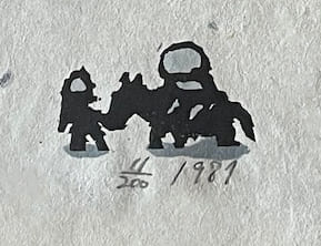 Cette estampe japonaise d’Iwao Akiyama illustre un moment du célèbre voyage à cheval de Matsuo Bashō, un poète japonais du XVIIe siècle, dans le cadre de sa célèbre œuvre « Sente étroite du bout du monde » (ou « Oku no Hosomichi »).