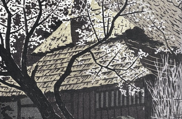 Shiro Kasamatsu, l’un des maîtres modernes du shin-hanga, excelle ici dans l’art de marier la tradition picturale japonaise à des influences plus contemporaines. Le jeu d’ombres et de lumière, si caractéristique de ses œuvres, confère à cette scène une atmosphère à la fois paisible et empreinte de mystère. Chaque détail, de l'écorce texturée des arbres au motif du toit, témoigne d'une maîtrise technique impressionnante et d'un amour profond pour la nature et l'architecture traditionnelle.
