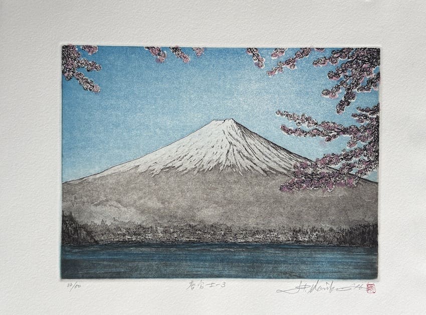 Cette estampe raffinée de Norikane Hiroto représente le Mont Fuji sous un ciel limpide, encadré par des branches de cerisiers en fleurs. La technique de l'eau-forte et aquatinte confère à l’image une texture subtile et une profondeur remarquable, mettant en valeur le contraste entre le sommet enneigé du Fuji et la délicatesse des pétales rosés. Le lac en premier plan, aux reflets paisibles, accentue la sérénité de la scène, créant une atmosphère à la fois contemplative et intemporelle.