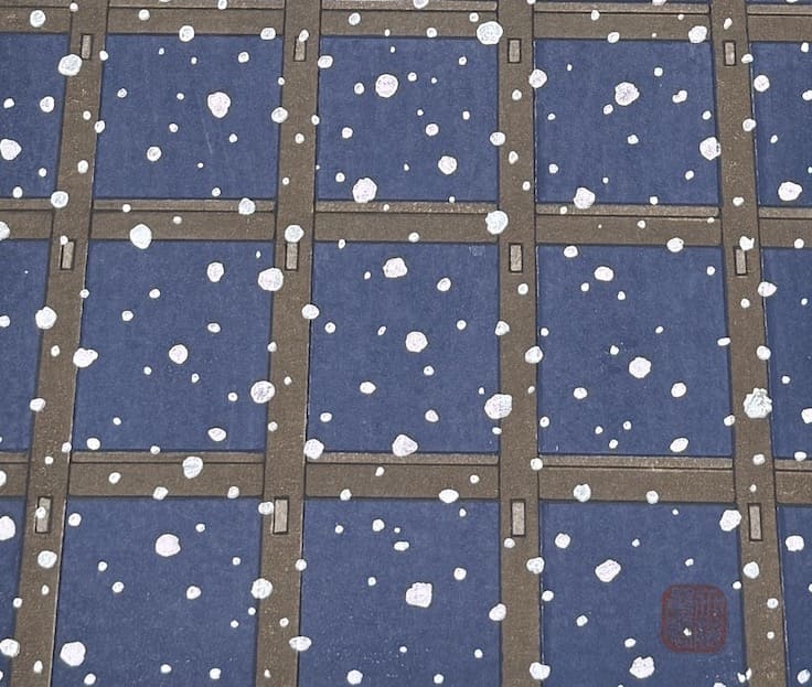 Katō Teruhide est renommé pour ses compositions architecturales modernes et épurées, qui marient rigueur géométrique et poésie visuelle. Dans cette estampe, la structure orthogonale du temple s’oppose à la chute irrégulière et fluide des flocons. Le contraste entre l’architecture immuable et l’éphémère de la neige traduit l’esthétique raffinée de Teruhide, héritier de la tradition de l’ukiyo-e tout en affirmant une sensibilité résolument contemporaine.