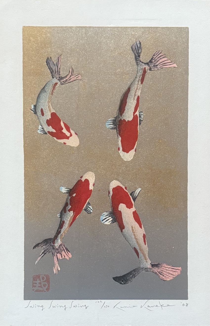 Avec Swing Swing Swing, Kunio Kaneko compose une danse silencieuse de carpes koi sur un fond délicatement métallisé. Une estampe raffinée, où le mouvement s’inscrit dans un espace de lumière et de calme.
