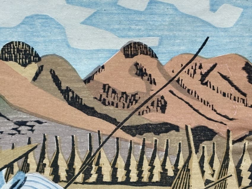 No no Musume-tachi rend hommage au travail agricole féminin, pilier discret mais central du Japon rural. La culture du chanvre, autrefois répandue dans tout l’archipel, symbolise une économie du quotidien fondée sur l’effort, la répétition et la transmission. L’estampe s’inscrit dans la volonté de Senpan de documenter les traditions et paysages en voie de disparition dans le Japon du XXe siècle. En les replaçant au centre de sa pratique artistique, il participe à l’esthétique mingei, valorisant les objets et les gestes de la vie ordinaire.