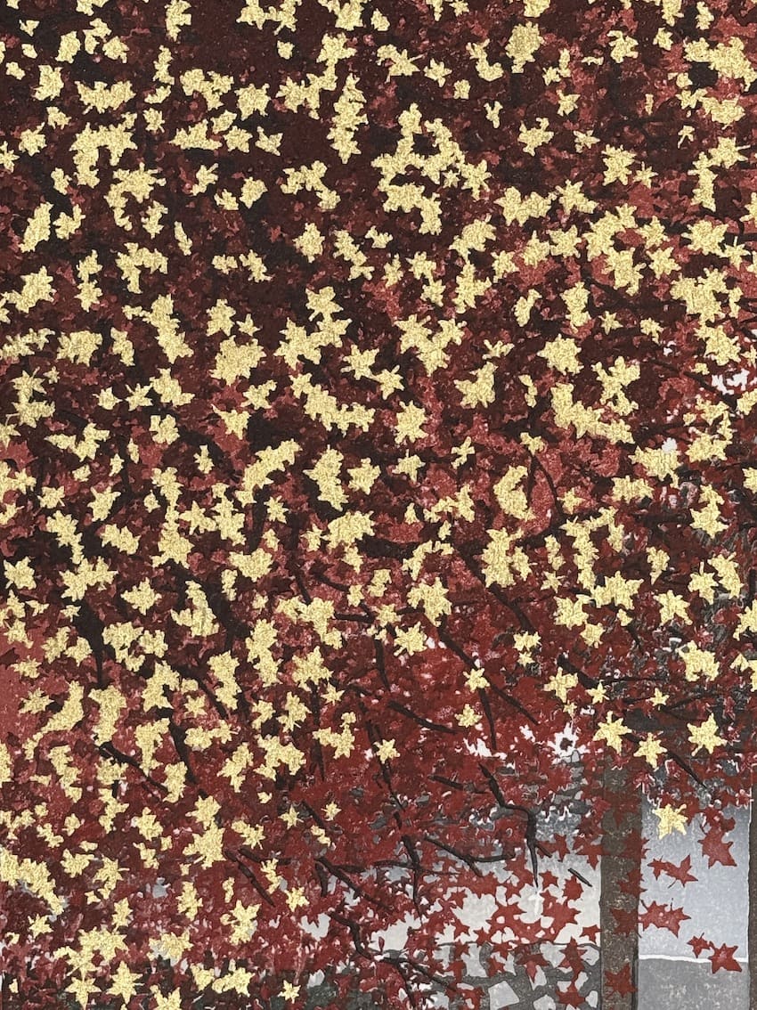 Miyamoto Shufuu excelle dans la représentation des saisons japonaises, et particulièrement de l’automne. Ici, il compose une scène à la fois statique et mouvante : l’architecture stable du portail contraste avec la légèreté des feuilles qui tombent. Le traitement délicat des textures – pierre, bois, feuillage – témoigne d’une virtuosité technique dans la gravure et l’impression. Les couleurs automnales sont traitées avec subtilité, allant des rouges profonds aux dorés, en passant par les gris froids de la pierre.